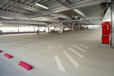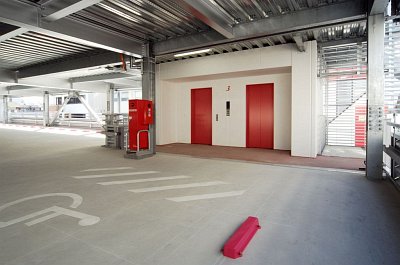 エレベーターの扉とフロアーの色を各フロアーごとに色分けして駐車階をわかりやすく。